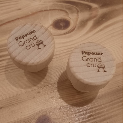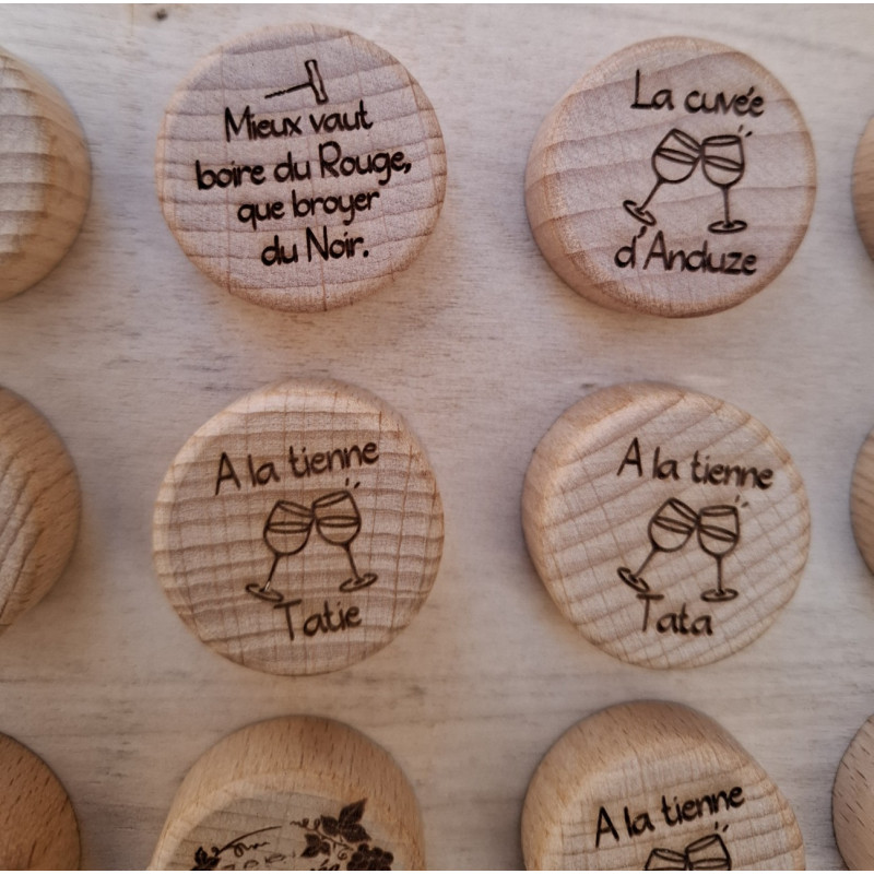 Bouchon de bouteille réutilisable, avec un dessus en bois naturel et un fond hermétique.
