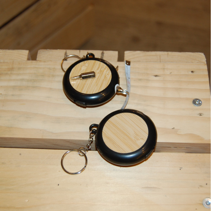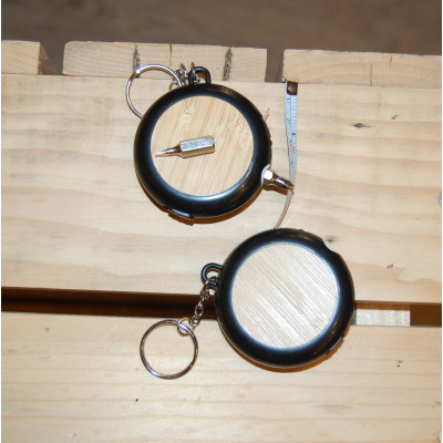 Pratique fabriqué en combinaison robuste de bambou, avec multi outil intégré dans le corps et fermeture par couvercle. 4 fonctions : lampe de poche à LED (piles bouton incluses), un mètre ruban à mesurer en centimètres et pouces; et une tête de tournevis magnétique avec pointes plates et cruciformes.