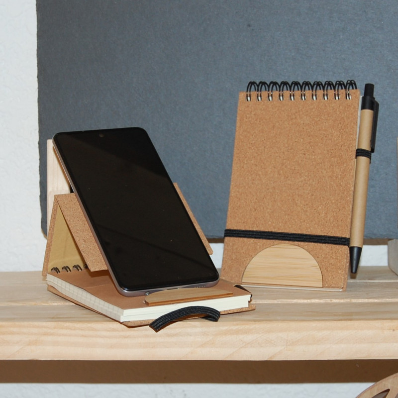 Carnet à anneaux en liège et bambou. Couvertures rigides avec un support de smartphone intégré polyvalent en bambou. Comprend également une bande de fermeture élastique et un porte-stylo de couleur assortie. 80 feuilles intérieures