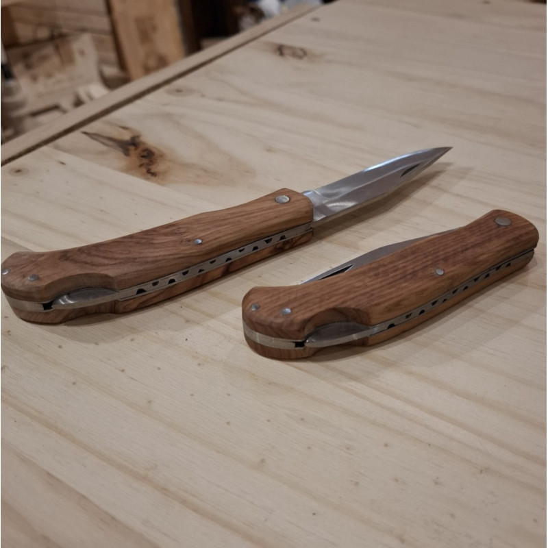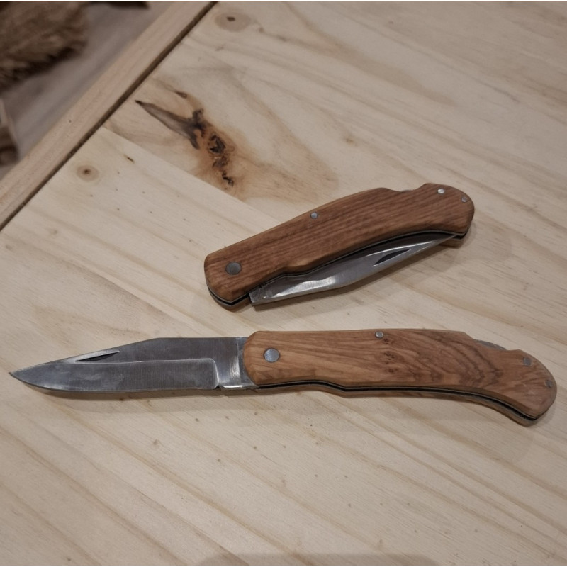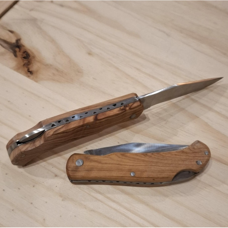 Pas d’extravagance ici, mais une ligne sobre, fonctionnelle et taillée pour durer. Le bois d’olivier, emblématique du bassin méditerranéen, est choisi pour sa densité, son toucher chaud et ses motifs uniques. Ce couteau trouve aussi bien sa place dans une poche de pantalon que dans un sac à dos, toujours prêt à vous accompagner au marché, en pique-nique ou au cœur du maquis.