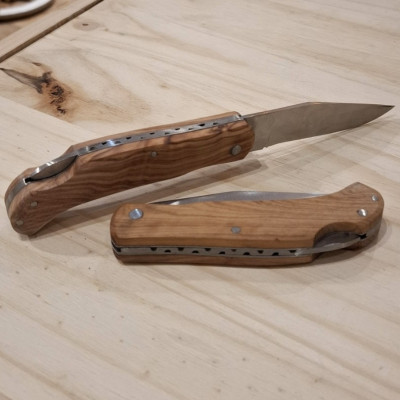 Inspiré des couteaux traditionnels portés par les bergers et chasseurs corses, ce modèle pliant en bois d’olivier incarne la fiabilité discrète.