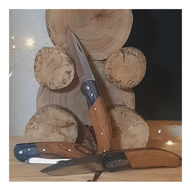 Couteau pliant - - Manche en bois Bi Color et sa cordelette Ce cadeau personnalisé deviendra un allié pour les balades en forêt et apprécié par son originalité , gravé il deviendra un cadeau unique