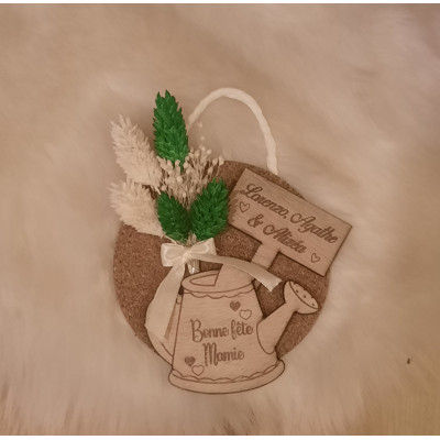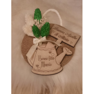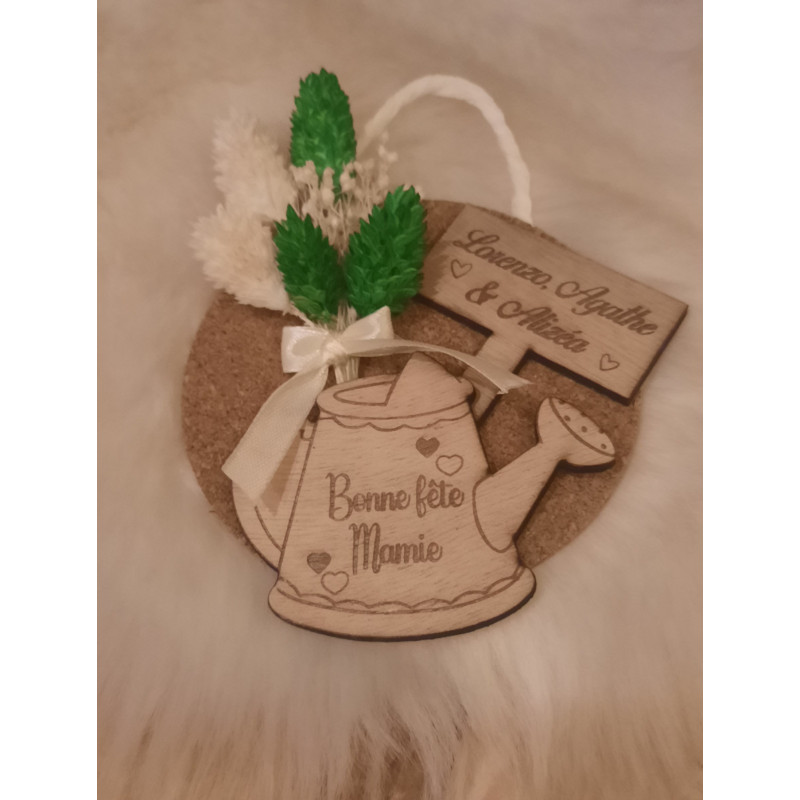 Arrosoir en bois et ses fleurs séchées , Bonne fête mamie et prénoms petits enfants