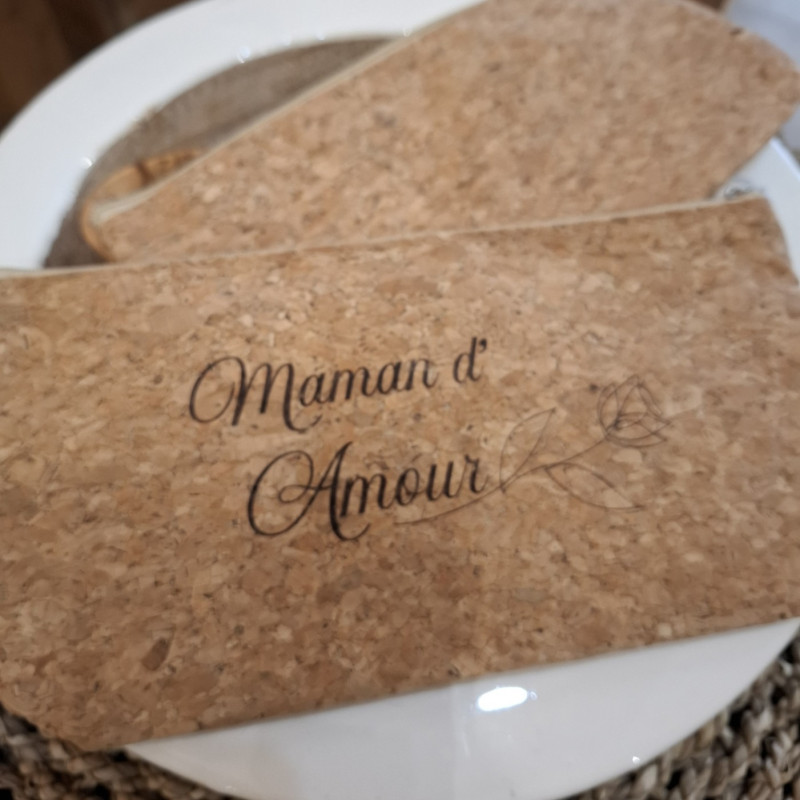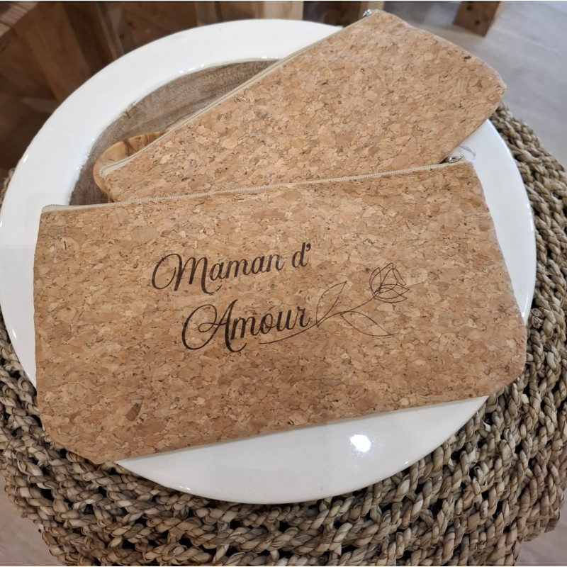 Petite trousse en liège personnalisée, elle sera gravée texte Maman d'Amour et sa jolie rose
