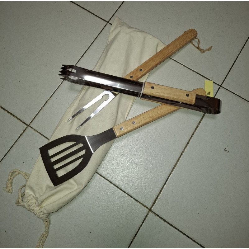Ensemble de barbecue. 3 accessoires en acier inoxydable avec manche en bois : couteau à trancher, pinces et spatule. Comprend une housse en coton de rangement
