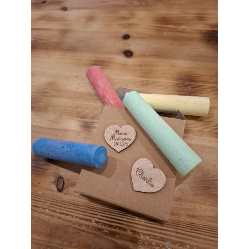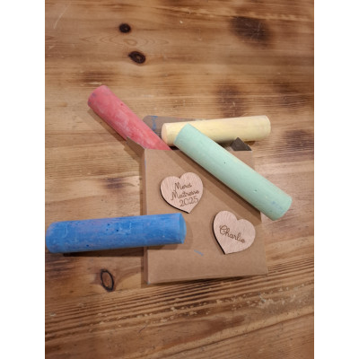 Spécial pour faire un petit clin d'œil à la maîtresse pour finir l'année scolaire en beauté, grosse craies en couleurs dans leur écrin en papier recyclé et ses petits cœurs en bois gravés, "Merci Maîtresse 2025" et sur l'autre le prénom de votre enfant