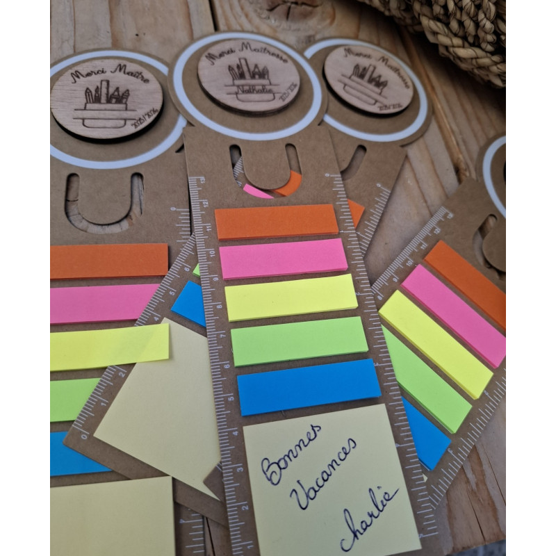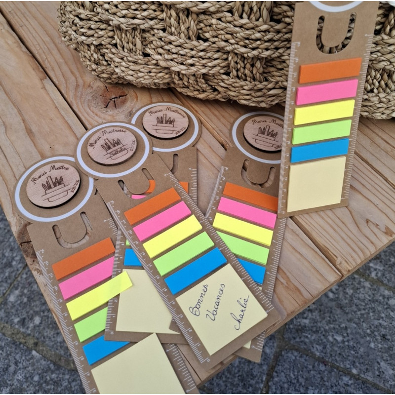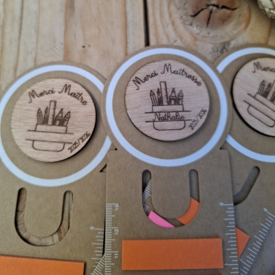Fabriquée en carton recyclé, avec un rond en bois découpé et gravé petit message pour les départs en vacances et petite attention pour la maîtresse , maître, aide scolaire ou atsem .