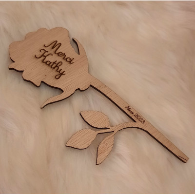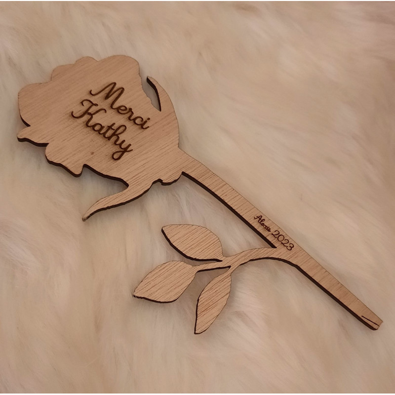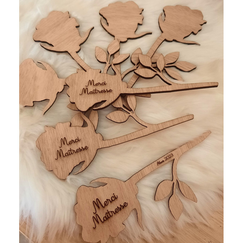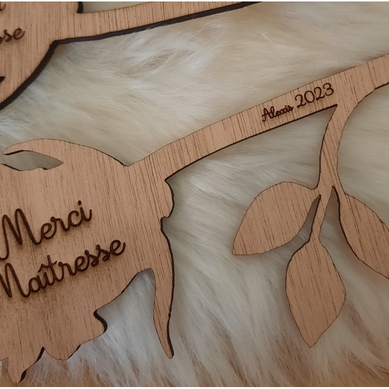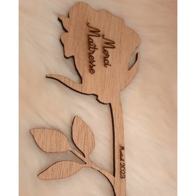 Rose en bois et gravée avec petit message , fin scolaire avec l'année en cours et le prénom de l'enfant