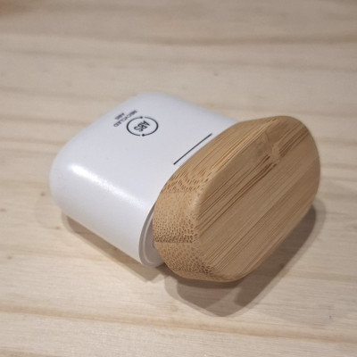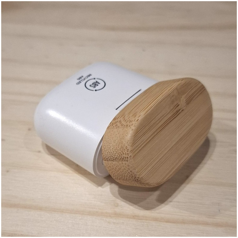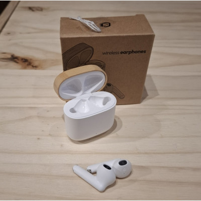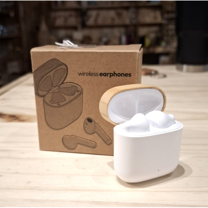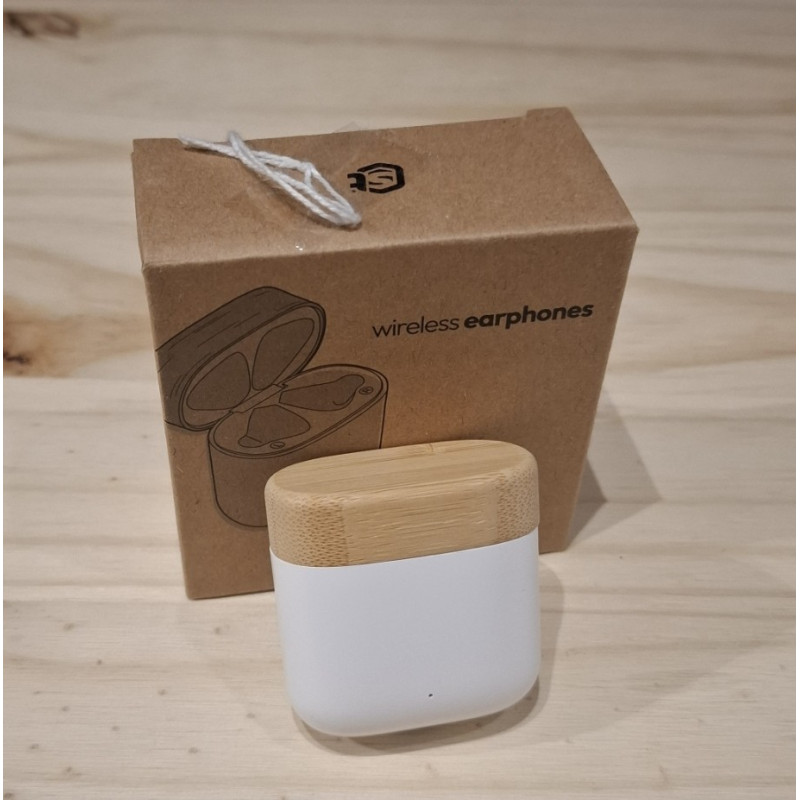 Écouteurs sans fil présentés dans un étui en ABS et bambou recyclé. Panneau de commande intégré avec technologie tactile. Fonction mains-libres. Batterie rechargeable. Câble de type-C inclus. Présentation en boîte écodesign.