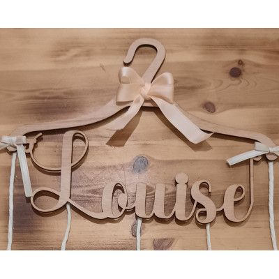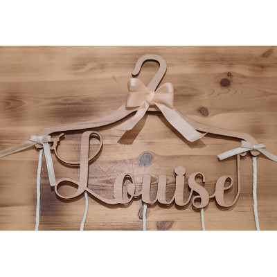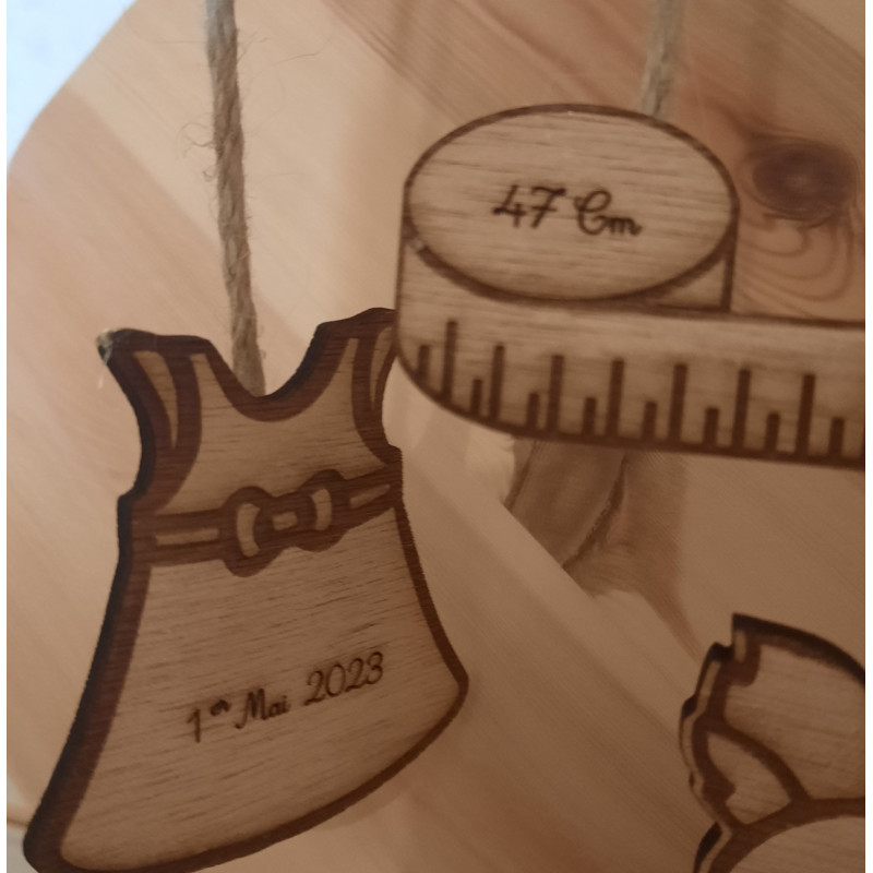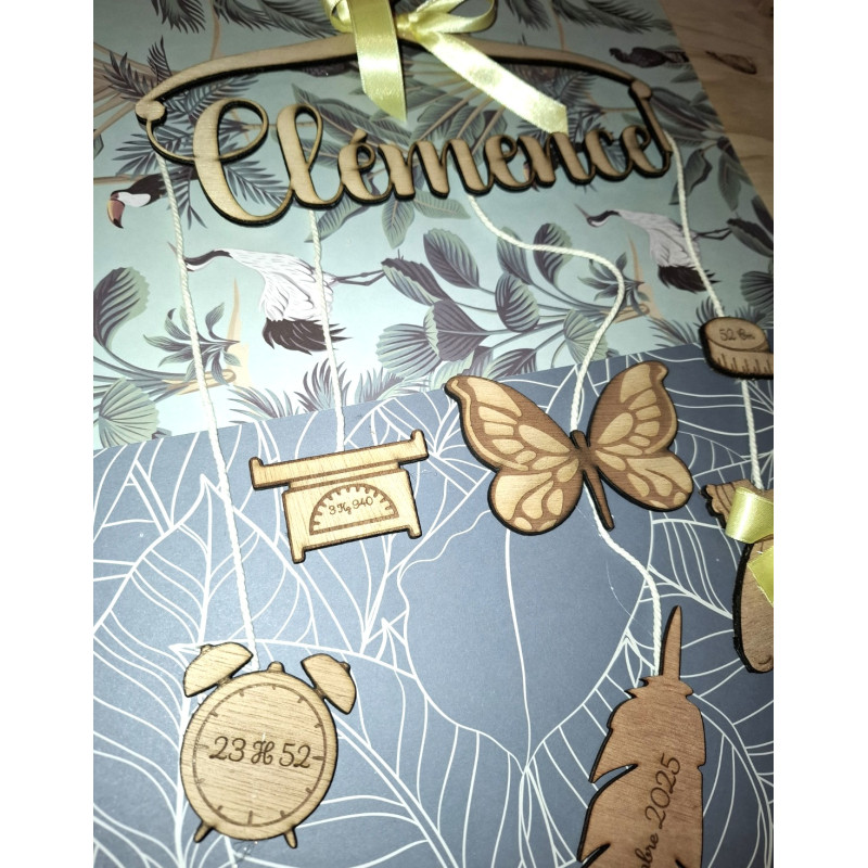 Cintre de naissance "Prénom "thème papillon et plume , en bois, découpé (3 mm ) , avec mobile : fille "robe", garçon "Body", une balance pour y graver le poids, un mètre pour y graver la taille , une horloge pour y graver l'heure de la naissance, nœud assortie au thème fille ou garçon