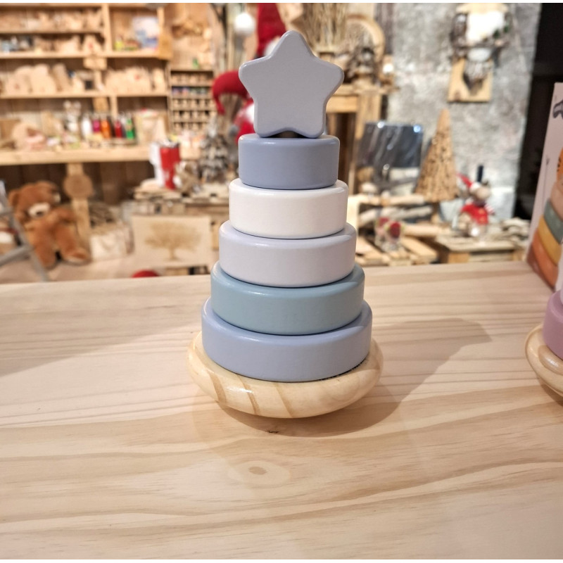 Qu'elle soit utilisée comme jouet éducatif ou comme élément décoratif, cette tour d'empilage allie fonctionnalité et design et constitue un cadeau idéal pour une naissance ou un baptême. Avec un pied arrondi qui permet à la tour d'empilage de se balancer joyeusement d'avant en arrière.