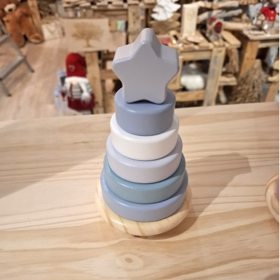 Avec ses différents anneaux empilables de couleurs dégradées, la tour favorise la motricité fine, la concentration et la reconnaissance des tailles.