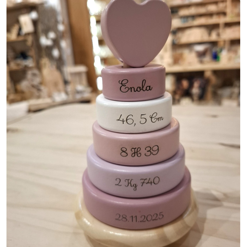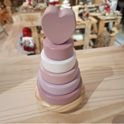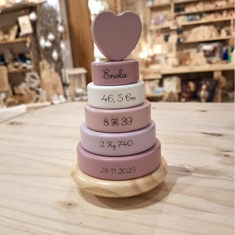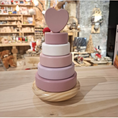 Avec ses différents anneaux empilables de couleurs dégradées, la tour favorise la motricité fine, la concentration et la reconnaissance des tailles.
