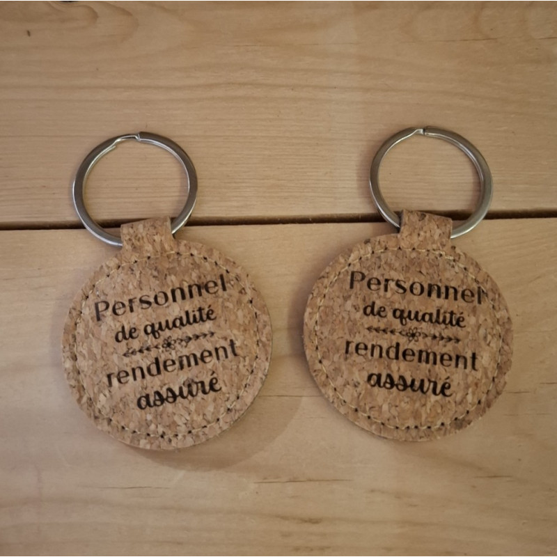Porte clé en Liège naturel , "Personnel de qualité, rendement assuré" , au verso possible d'y ajouter un prénom