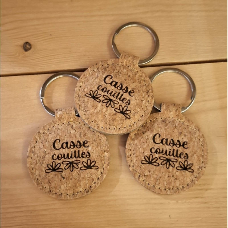 Porte clé en Liège naturel , "Casse couilles" , au verso possible d'y ajouter un prénom