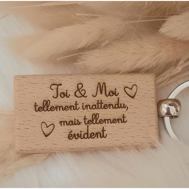 Porte clé en bois, " Toi et moi , tellement inattendu , mais tellement évident", au verso possible d'y ajouter un prénom